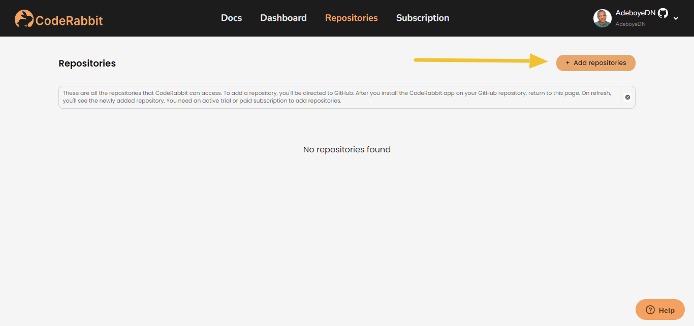 To add additional repositories after the sign-up, go to the repositories page within the CodeRabbit UI.